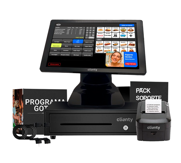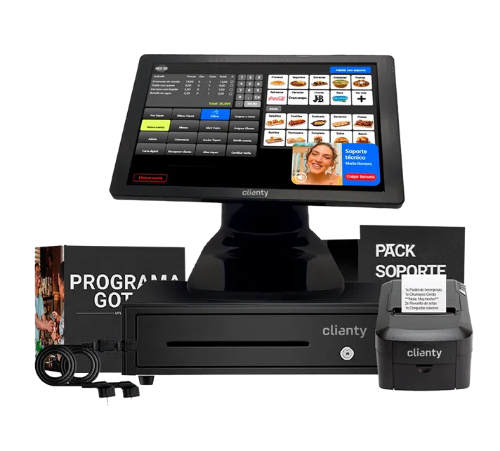 - Con impresora térmica de 80mm y cajón portamonedas clienty.